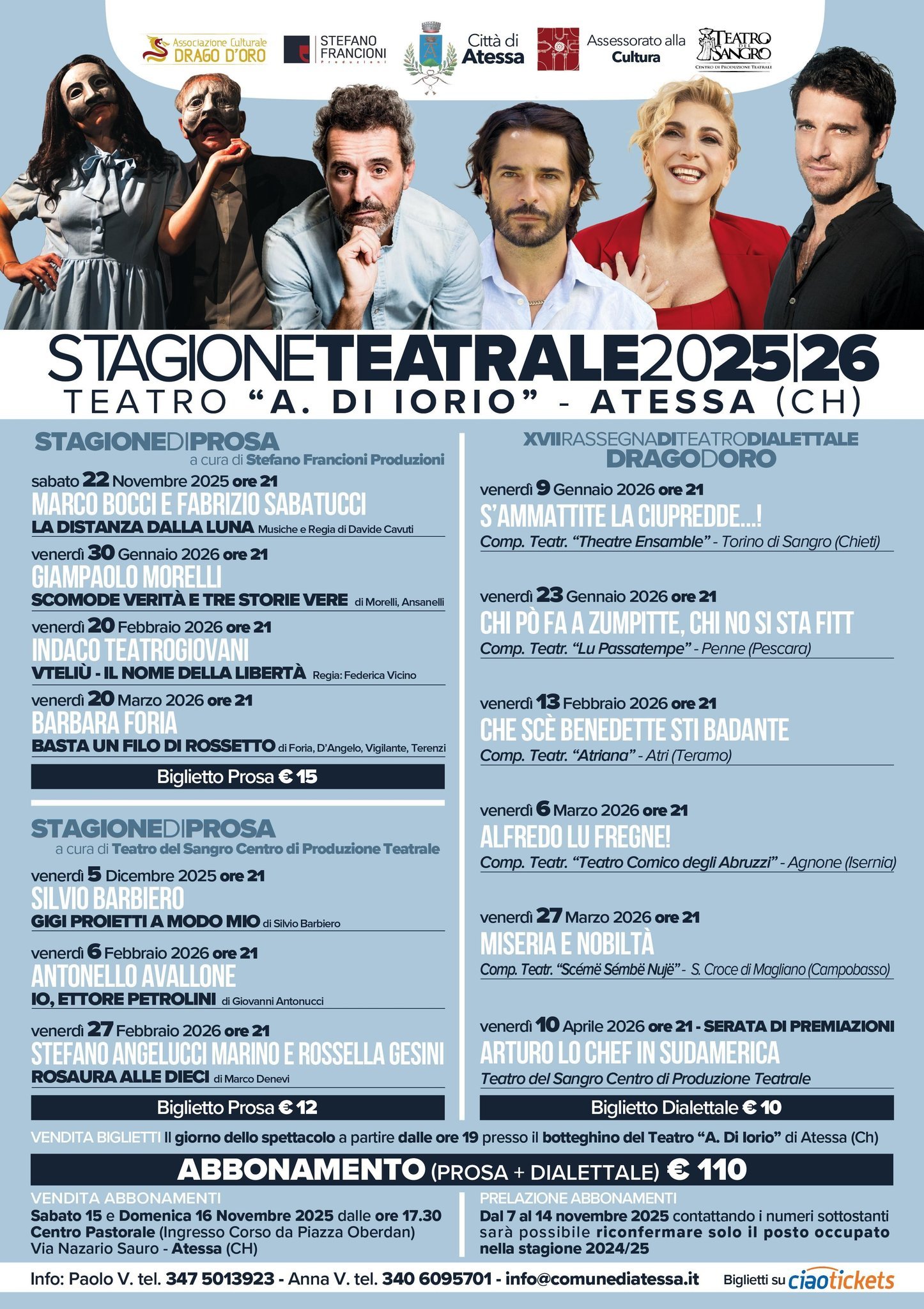 “Sarà una stagione ricca di emozioni e grandi interpreti, ha dichiarato l’Assessore alla Cultura Ilenia Tumini. Venerdì 22 novembre avremo con noi Marco Bocci, attore amatissimo e volto noto di cinema, televisione e teatro. Con il suo nuovo spettacolo, Bocci aprirà la stagione con un racconto intenso che parla di pace. Il nostro teatro ospiterà anche il noto attore Giampaolo Morelli e l’attrice e comica Barbara Foria. Un cartellone vario e di qualità, con attori di fama nazionale e compagnie provenienti da tutto l’Abruzzo. Un invito a tornare in sala, a condividere il piacere dello spettacolo dal vivo e a lasciarsi trasportare da quella magia che solo il teatro sa regalare”.